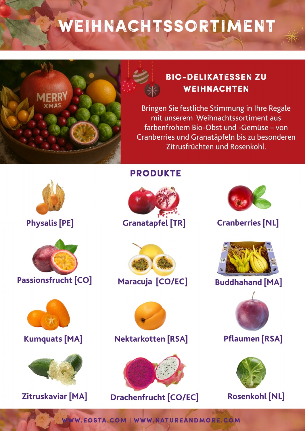 Die Feiertage sind der ideale Zeitpunkt, um mit Farbe, Duft und Erlebnis zusätzliche Aufmerksamkeit zu erregen. Mit dieser Auswahl verleihen Sie Ihrem Obst- und Gemüseregal eine festliche Ausstrahlung, die Kunden inspiriert – von Winterklassikern bis hin zu überraschenden exotischen Akzenten.